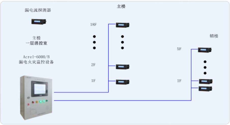 針對本項(xiàng)目的性質(zhì)及配電結(jié)構(gòu),現(xiàn)針對其主樓(18層)、輔樓(5層),兩棟樓設(shè)計(jì)一套電氣火災(zāi)監(jiān)控系統(tǒng)。在主樓和輔樓的樓層配電箱的進(jìn)線端安裝漏電流探測器,由此來實(shí)時(shí)監(jiān)測變電所內(nèi)重要回路的漏電流,以確保變電所配電系統(tǒng)的電氣安全。
