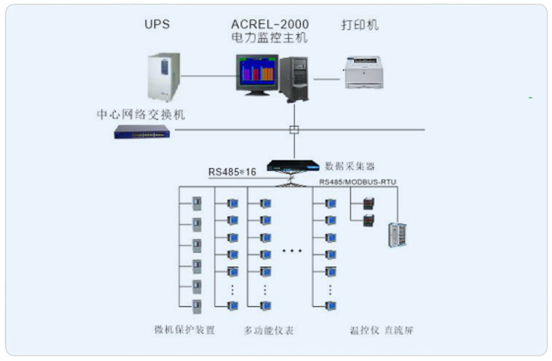 系統(tǒng)采用Acrel-2000型電力監(jiān)控系統(tǒng),分別在利爾達(dá)和利合達(dá)各設(shè)置一套電力監(jiān)控系統(tǒng),實(shí)現(xiàn)對高低壓配電回路的實(shí)時監(jiān)控,有利于用電管理。另一方面,電力監(jiān)控系統(tǒng)不僅能夠準(zhǔn)確的表示出回路的用電狀況,它還具備網(wǎng)絡(luò)通訊等功能,能夠與計(jì)算機(jī)、串口服務(wù)器等設(shè)備進(jìn)行組合,從而實(shí)現(xiàn)遠(yuǎn)程監(jiān)控。