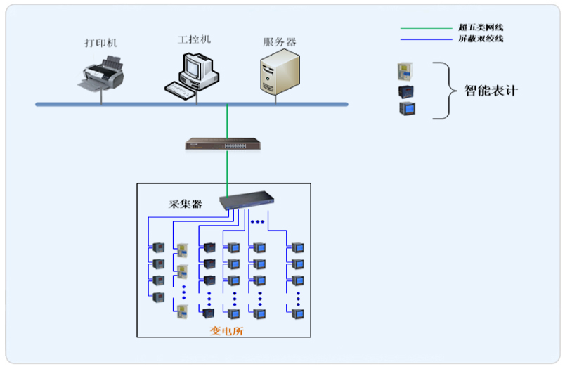 系統(tǒng)采用Acrel-2000型電能管理系統(tǒng),整個系統(tǒng)采用網(wǎng)絡(luò)分布式結(jié)構(gòu),監(jiān)控主機位于變電所內(nèi)值班室,變電所內(nèi)配置一套采集設(shè)備進(jìn)行數(shù)據(jù)的采集,所有配電回路均配備智能儀表。該項目實現(xiàn)了安國酒店變電所的配電回路重要數(shù)據(jù)的實時采集,存儲,顯示。所有監(jiān)控設(shè)備均通過屏蔽雙絞線連接至采集箱的通訊采集器,再通過網(wǎng)線將數(shù)據(jù)傳輸至系統(tǒng)主機,從而實現(xiàn)電力監(jiān)控系統(tǒng)的整體搭建。