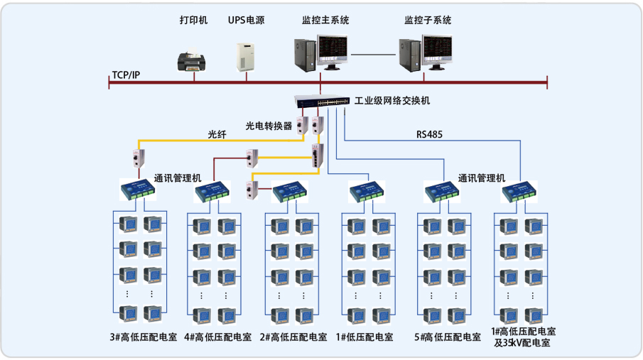浦江雙輝大廈監控部分有1個35kV配電室, 1#、2#、3#、4#、5#5個配電室分10kV高壓和0.4kV低壓。35kV配電室有高壓電力儀表、綜保和2臺變壓器溫控儀,另外5個配電室有10kV高壓電力儀表和綜保,0.4kV低壓部分有電力儀表和22臺變壓器溫控儀。35kV和1#配電室分布在A棟的B2層,2#配電室分布在B棟的B2層,3#配電室分布在A棟的33樓,4#配電室分布在B棟的33樓,5#配電室分布在A棟的B4層。針對浦江雙輝大廈的實際情況,通過計算機和通訊網絡,將分散的配電所的現場設備連接為一個有機的整體,實現電網設備運行的遠程監控和集中管理。