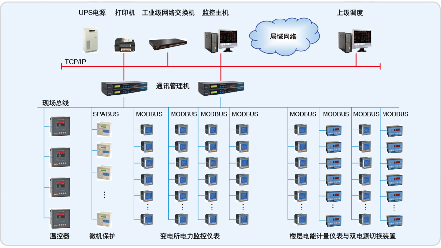 整個系統采用網絡分布式結構,監控主機位于地下一層變電所值班室內,各變電所配電柜內安裝有本公司ACR230ELH、ACR220EFLK儀表共計200多回 路。系統采用開放的通訊協議,通過現場總線與高低壓配電系統、變壓器溫控裝置、發電機的智能接口、ATSE及EPS等相連,實現數據通訊功能。同時監視系統提供標準的RS485接口向上連接到BMS系統。