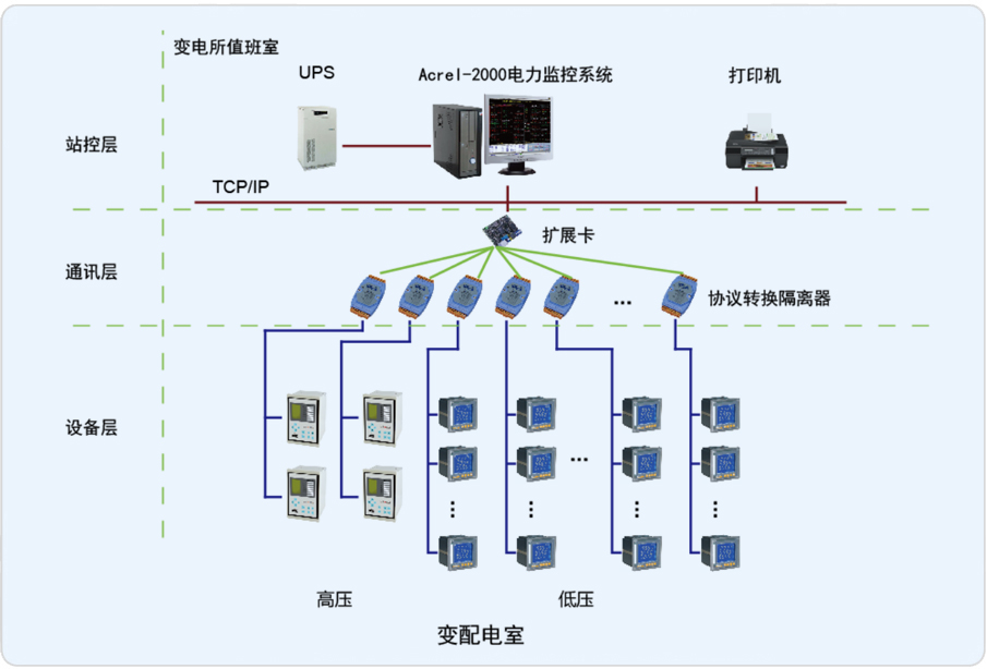 本項目承接其10KV配電增容改造變電所部分電力監(jiān)控系統(tǒng),其中有兩路高壓進線,配有綜合保護裝置,低壓部分,進線柜、饋線柜配有儀表。通過Acrel-2000電力監(jiān)控系統(tǒng),實時監(jiān)測變電所內各個回路的電流、電壓、功率、開關狀態(tài)等電參量,由此達到變電所少人值守或無人值守的智能化管理。