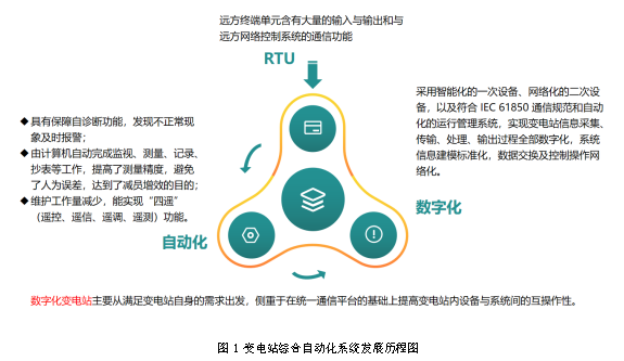 變電站綜合自動(dòng)化系統(tǒng)是指完成以下基本功能: l 從當(dāng)?shù)睾瓦h(yuǎn)方獲取電力系統(tǒng)信息; l 支持當(dāng)?shù)厥謩?dòng)和自動(dòng)功能; l 在變電站自動(dòng)化系統(tǒng)和電網(wǎng)管理系統(tǒng)之間,提供與開關(guān)設(shè)備的通信連接和接口。 這些功能可以由大量裝用的智能電子設(shè)備(IED)不同程度的組合來實(shí)現(xiàn)。 變電站綜合自動(dòng)化系統(tǒng)的發(fā)展主要經(jīng)歷了三個(gè)階段; 1)歷史上,開關(guān)設(shè)備和網(wǎng)絡(luò)管理系統(tǒng)的接口是在各變電站的遠(yuǎn)方終端單元(RTU)。RTU是一個(gè)集中單元,含有大量的輸入與輸出,基本沒有當(dāng)?shù)毓δ?,但是具有與遠(yuǎn)方網(wǎng)絡(luò)控制系統(tǒng)的通信功能。結(jié)構(gòu)上僅是站級(jí)概念,現(xiàn)場(chǎng)有關(guān)重要信息(如保護(hù)動(dòng)作信息等)通過硬接點(diǎn)送給RTU裝置,變電站的監(jiān)測(cè)量一般經(jīng)變送器變換后送給RTU,開關(guān)量監(jiān)測(cè)是直接引至RTU,RTU的控制輸出一般經(jīng)遙控執(zhí)行柜發(fā)出控制命令。整體系統(tǒng)功能不強(qiáng)、硬件設(shè)備重復(fù)、整體性能指標(biāo)低、適合于老系統(tǒng)改造。 2)相比與RTU,變電站自動(dòng)化系統(tǒng)以不同程度的分散結(jié)構(gòu)實(shí)現(xiàn)上述基本功能,通過這些功能可對(duì)變電站進(jìn)行管理,實(shí)現(xiàn)從線路隔離與接地到收集狀態(tài)監(jiān)測(cè)數(shù)據(jù)等所有自動(dòng)化功能。RTU的通信功能在變電站自動(dòng)化發(fā)展中變?yōu)橥ㄐ沤涌冢赏ㄐ啪W(wǎng)關(guān)執(zhí)行,根據(jù)所用的通信協(xié)議,網(wǎng)關(guān)將規(guī)約雙向轉(zhuǎn)換(即規(guī)約轉(zhuǎn)換器),在變電站自動(dòng)化分布式智能電子設(shè)備中存儲(chǔ)的信息通過網(wǎng)關(guān)傳送給SCADA主站與遠(yuǎn)方調(diào)度電網(wǎng)管理系統(tǒng)。 3)隨著信息技術(shù)已經(jīng)進(jìn)步到可以實(shí)現(xiàn)廣域保護(hù),依靠協(xié)調(diào)防御計(jì)劃來保護(hù)整個(gè)電力系統(tǒng),以及IEC61850作為《變電站通信網(wǎng)絡(luò)和系統(tǒng)》的新國(guó)際標(biāo)準(zhǔn),數(shù)字化變電站將以三層兩網(wǎng)式部署,三層分別是指站控層設(shè)備、間隔層設(shè)備和過程層設(shè)備,兩網(wǎng)分別是指站控層網(wǎng)絡(luò)和過程層網(wǎng)絡(luò)。間隔層包括數(shù)字式保護(hù)、計(jì)量、監(jiān)控等二次設(shè)備,負(fù)責(zé)間隔內(nèi)信息的運(yùn)算處理與控制,以及與過程層和站控層之間的網(wǎng)絡(luò)通信工作;過程層主要包括電子式互感器、合并單元、智能斷路器、智能開關(guān)、智能終端,該層主要實(shí)現(xiàn)信號(hào)的采集和對(duì)系統(tǒng)的操作控制。三層設(shè)備之間通過分層、分布、開放式的兩層網(wǎng)絡(luò)實(shí)現(xiàn)連接,兩層網(wǎng)絡(luò)物理上相互獨(dú)立,站控層網(wǎng)絡(luò)構(gòu)建為全站統(tǒng)一的MMS網(wǎng),過程層網(wǎng)絡(luò)則包括GOOSE網(wǎng)和SV網(wǎng)。但數(shù)字化變電站設(shè)置了大量的智能終端、交換機(jī)等過程層設(shè)備,使得整體動(dòng)作延時(shí)增加、網(wǎng)絡(luò)復(fù)雜。 圖1 變電站綜合自動(dòng)化系統(tǒng)發(fā)展歷程圖